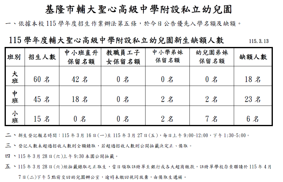 115學年度新生缺額公告